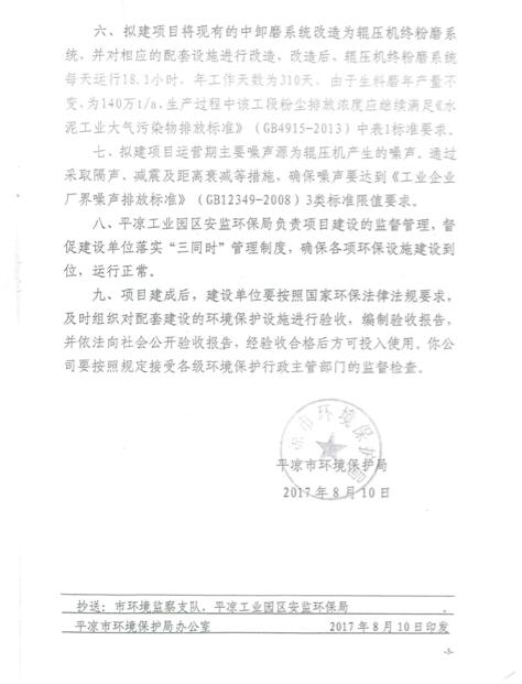 本项目是由平凉祁连山水泥有限公司委托兰州洁华环境评价咨询有限公司开展环境影响评价并编制完成《平凉祁连山水泥有限公司生料磨节能降耗技术改造项目环境影响报告表》,2017年8月10日,平凉市环境保护局以(平环评发〔2017〕138号)文对该项目环境影响报告表进行了批复。项目于2017年8月开工建设,2018年2月技改完工后投入生产,验收监测期间更换的生产设备及环保设施均运行正常。