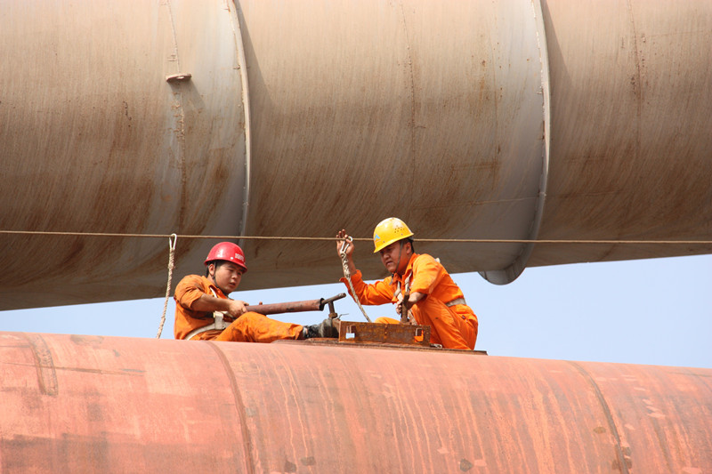 7月26日—8月3日,成县公司组织开展1号水泥窑检修,为下半年安全稳定生产保驾护航。本次检修共涉及99项,其中,煤磨至给煤机加装锁风喂料器和窑主传电机冷却风机安装两项为技术改造项目。图为维修部职工正在更换水泥窑检修门的丝杠。(路永梅/报道)