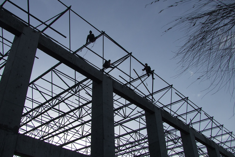 为了便于存储原煤,平凉公司于今年8月开始修建原煤堆棚,目前已进入顶棚安装阶段。图为施工人员正在搭建顶部的龙骨。(郭阿龙/报道)