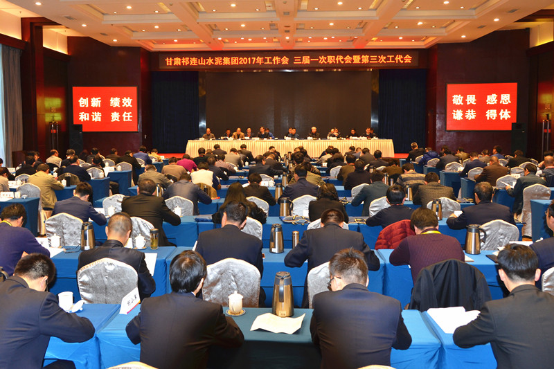本网讯 2月27日,公司在兰州召开2017年工作会、三届一次职代会暨第三次工代会?;嵋檠按锪酥泄ú募?017年工作会精神,认真听取了甘肃省建材工业协会会长刘旭宾和公司董事长脱利成的讲话,听取和审议了公司总裁刘继彬代表经营班子所作的工作报告和魏士渊同志所作的工会工作报告?;嵋檠【俨斯拘乱唤旃せ嵛被岷凸せ峋焉蟛槲被?。