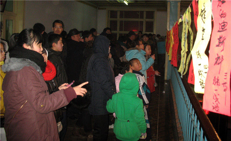1月31日晚,永登公司在工人俱乐部举行了2011年迎新春游艺晚会。晚会内容丰富多采,老少咸宜,既有传统项目“猜灯谜”,也有广受欢迎的“保龄球”、“摸鼻子”、“投篮”、“套圈”等活动,大家在欢声笑语中自由选择着自己喜好的活动项目。图为职工群众猜灯谜的情景。(谢宝林/摄)