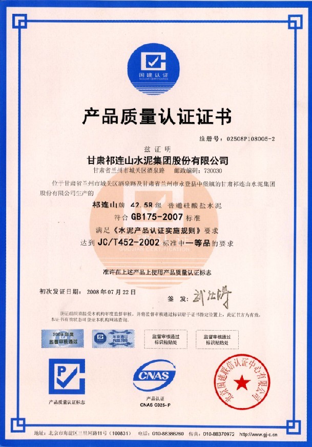 42.5R普通硅酸盐水泥产品质量认证证书-集团公司