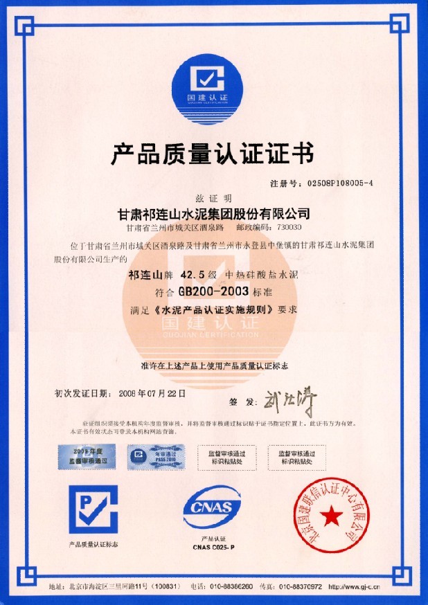 42.5中热硅酸盐水泥产品质量认证证书-集团公司