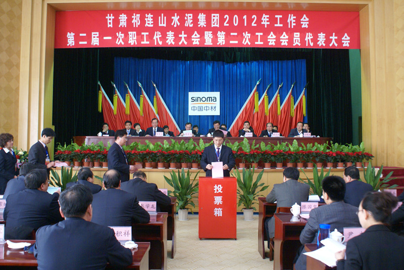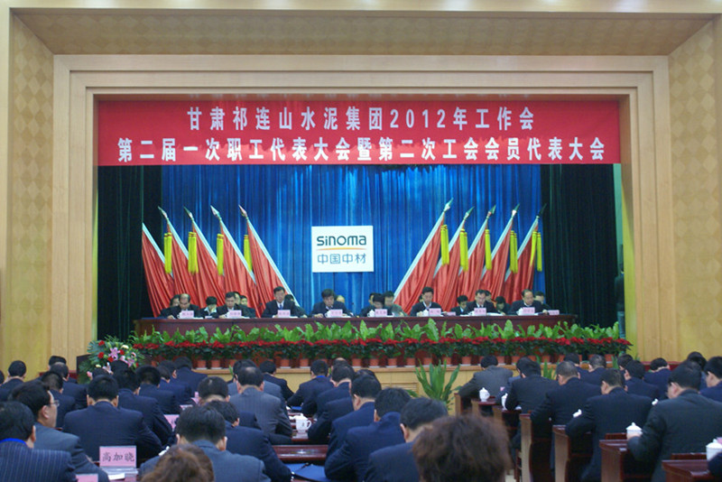 本网讯 2月13-14日,公司2012年工作会、第二届一次职工代表大会暨第二次工会会员代表大会在兰州西北宾馆隆重召开。会议学习传达了中材集团2012年工作会精神,认真听取了市总工会副主席康灵娜和公司董事长脱利成、党委书记蔡军恒的讲话,听取和审议了公司总裁刘继彬代表经营班子所作的工作报告和工会主席魏士渊所作的工会工作报告,讨论了公司职工代表大会制度和民主管理综合工作委员会工作制度,选举产生了公司第二届工会委员会和工会经费审查委员会,表彰奖励了平凉公司全员劳动竞赛暨生产管理优胜单位、永登公司等3个职工技术比武优秀单位、许亚峰等10名职工技术比武优秀个人、永登公司熟料一部等12个文明竞赛先进单位。